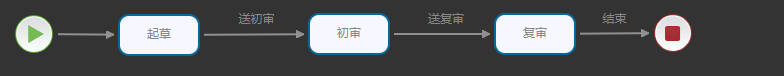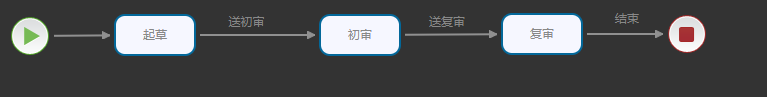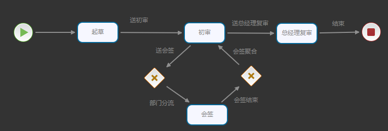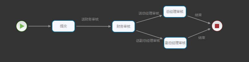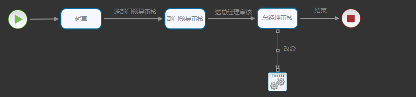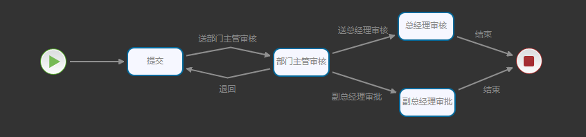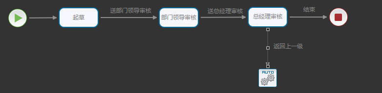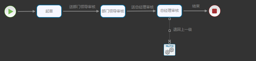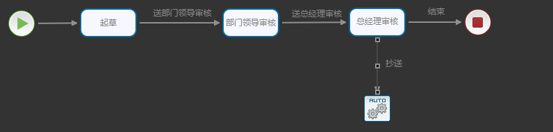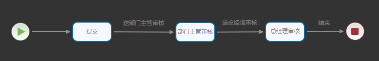 应用案例: 起草人起草窗体,需要先由部门主管审核,再由总经理审核,流程如下图: