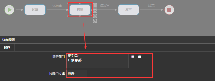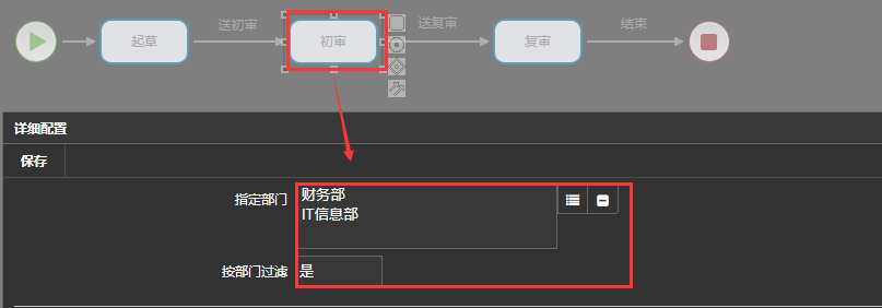 - 设置【初审】节点的指定部门为IT信息部和财务部,按部门过滤选择【是】,如下图: