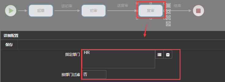 - 设置【复审】节点的指定部门为HR部,按部门过滤选择【否】,如下图: