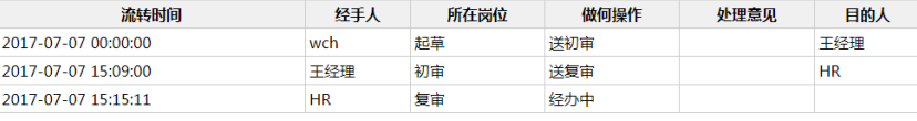 - IT信息部的人员(wch)起草窗体提交初审,IT信息部流程管理员(王经理)审核通过后,提交复审,HR部审核人员(HR)审核通过后流程结束。复审节点审核人员(HR)登录系统点击窗体,点击流转记录查看效果如下图: