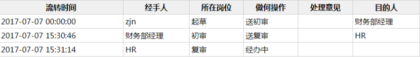 - 财务部的人员(zjn)起草窗体提交初审, 财务部流程管理员(财务部经理)审核通过后,提交复审,HR部审核人员(HR)审核通过后流程结束。复审节点审核人员(HR)登录系统点击窗体,点击流转记录查看效果如下图: