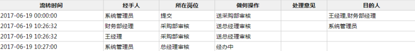 允许应用案例 :允许接受上个节点指定人员,实现在窗体提交的时候,可以人为选定下个节点由哪些人员进行审批,当前节点为【采购部审核】,系统流程如下图: