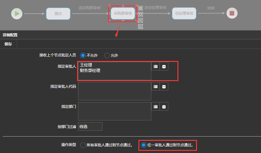 - 在“采购部审核”节点设置指定审批人为王经理和财务部经理,并且选择操作类型为【任一审批人通过,则节点通过】,如下图: