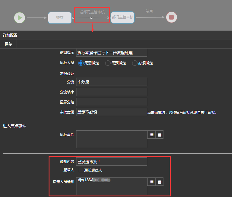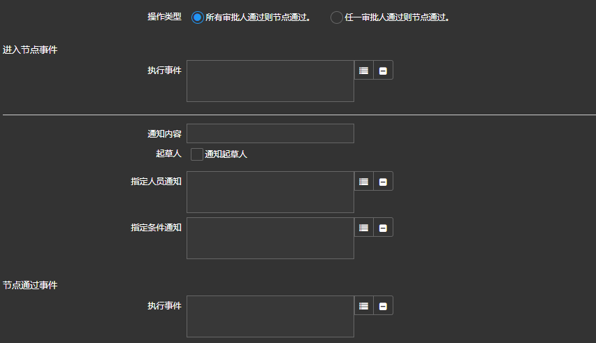 节点通过事件 :流程通过该节点的事件,可设置通知起草人和内容、通知指定人员、根据设定条件选择通知人员、执行事件。
