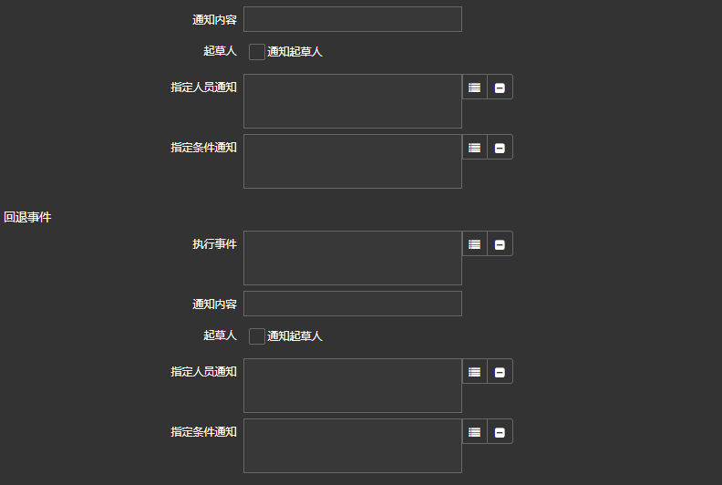 回退事件 :流程在该节点进行回退的事件,可设置通知起草人和内容、通知指定人员、根据设定条件选择通知人员、执行事件。详细设置参考进入节点事件章节。