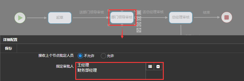 - 在“部门领导审核”节点指定审核人员为:王经理、财务部经理,如下图: