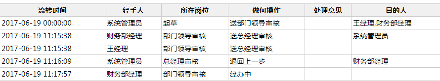 应用案例 :在“部门领导审核”节点需要王经理、财务部经理两人进行审核,两人完成审批后,流程到达“总经理审核”,此时选择返回上一级,系统将流程退回“部门领导审核”节点,需要王经理、财务部经理两人重新进行审批。