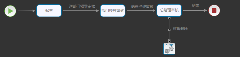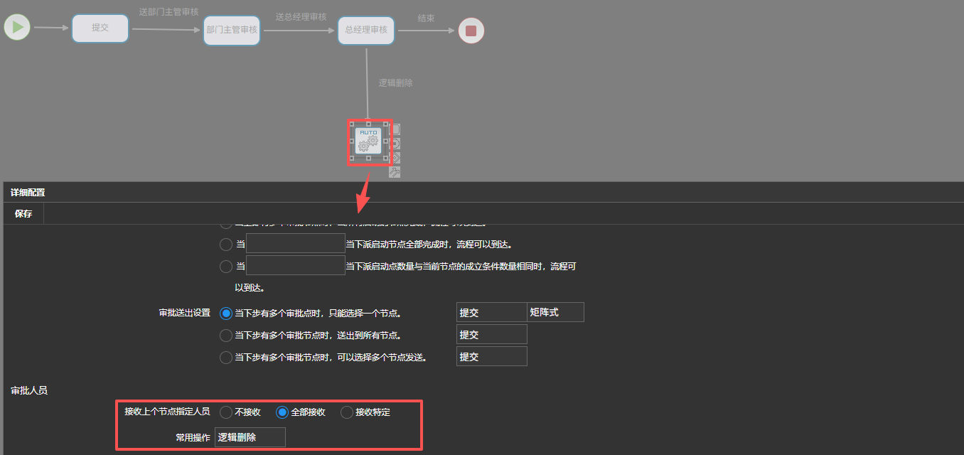 操作如下 :在“总经理审核”添加自动控件,并设置自动控件的常用操作为逻辑删除,如下图: