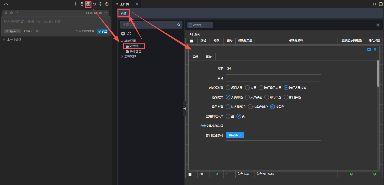 - 点击【工作流设计器】→【基础设置】→【对话框】→【新建】,对话框类型为“流程人员过滤”,如下图: