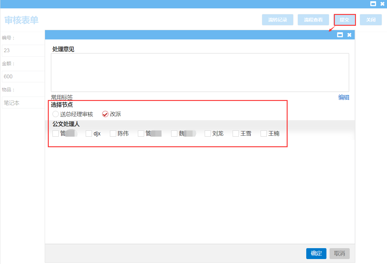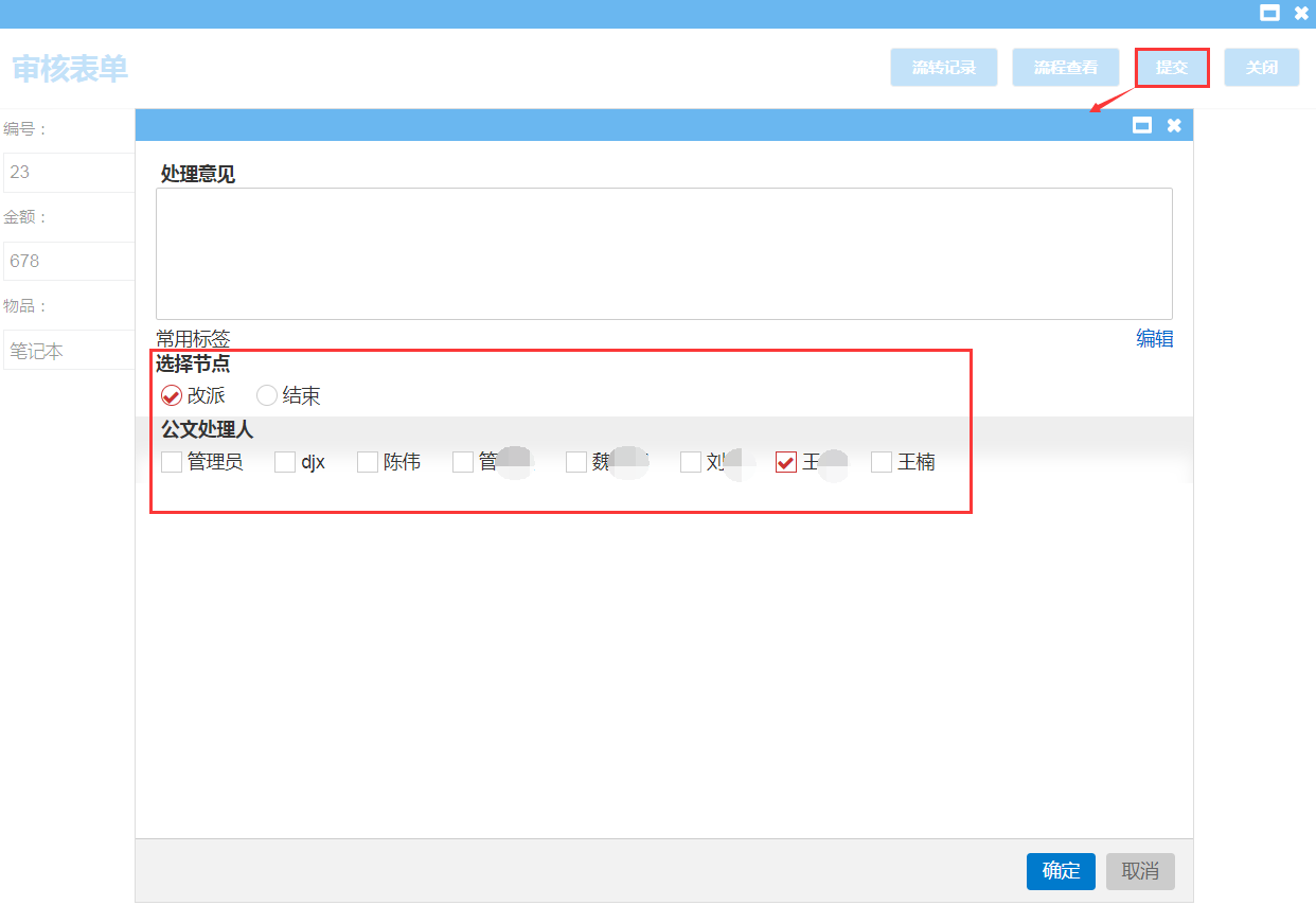 效果如下 :在“部门主管审核”节点点击【提交】,点击【改派】,选择人员实现改派功能,如下图: