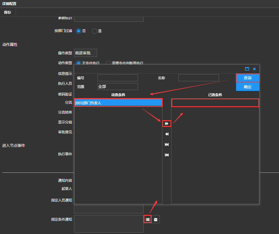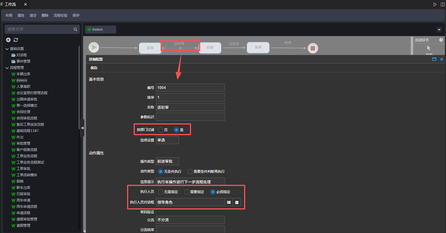 - 设置连线控件“送初审”按部门过滤:是,并指定执行人员对话框,如下图: