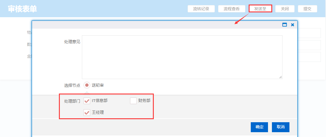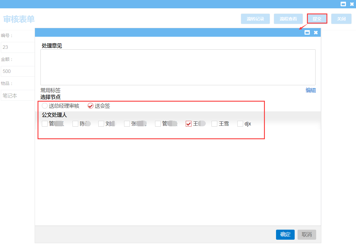效果如下 :在“部门主管审核”节点,点击【提交】,选择【送会签】选择会签人员,如下图: