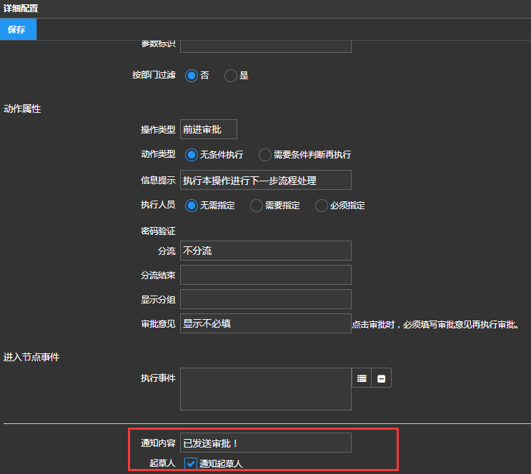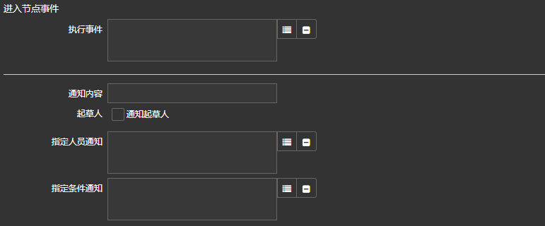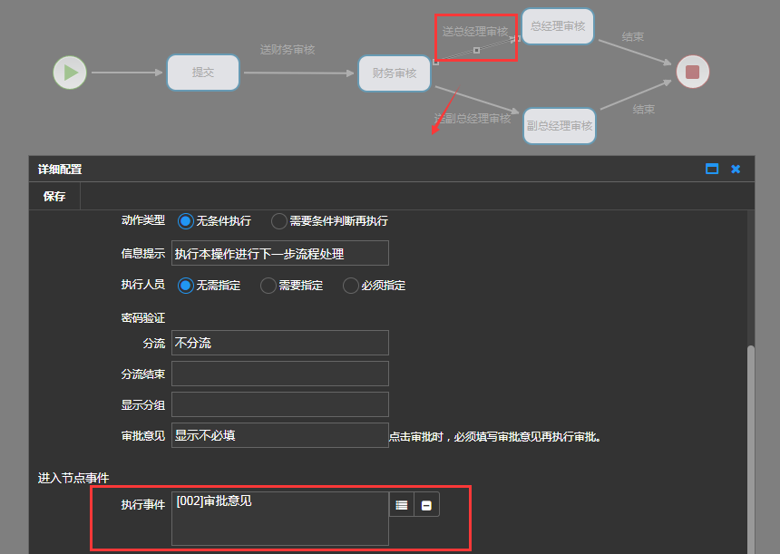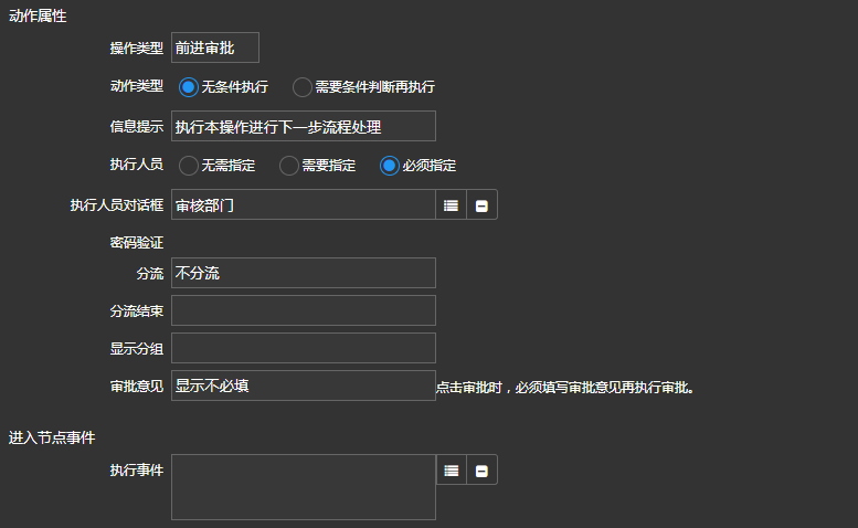 进入节点事件 :流程进入该节点的事件,可设置操作类型和执行事件。