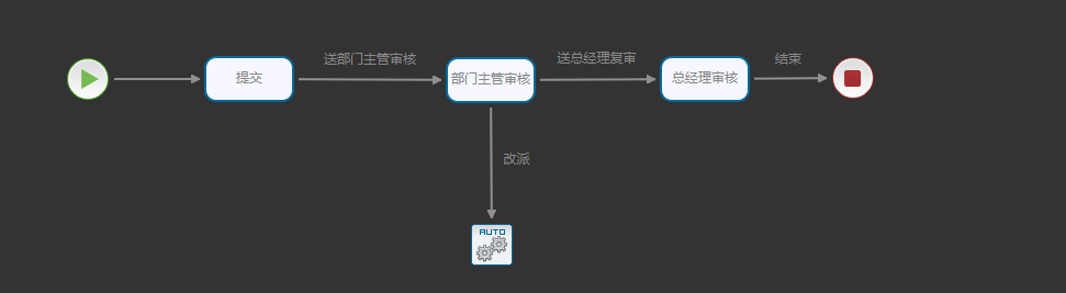 应用案例 :在“部门主管审核”节点进行功能处理,生成单独按钮,实现改派由当前审批节点执行人指定给其他审批人进行处理的功能,流程如图: