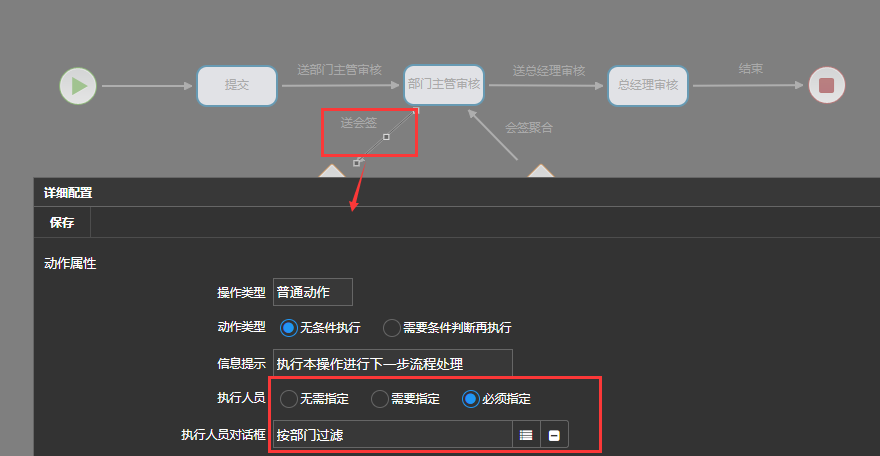 - 添加“送会签”连线,并在此处指定需要参与会签的人员,设置会签人员,如下图: