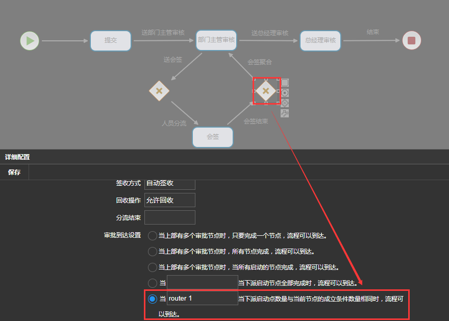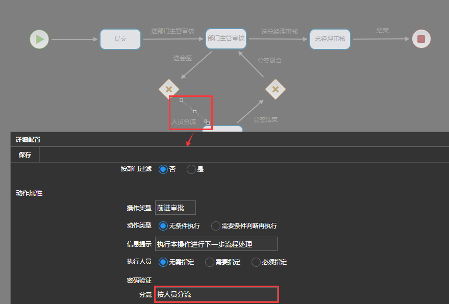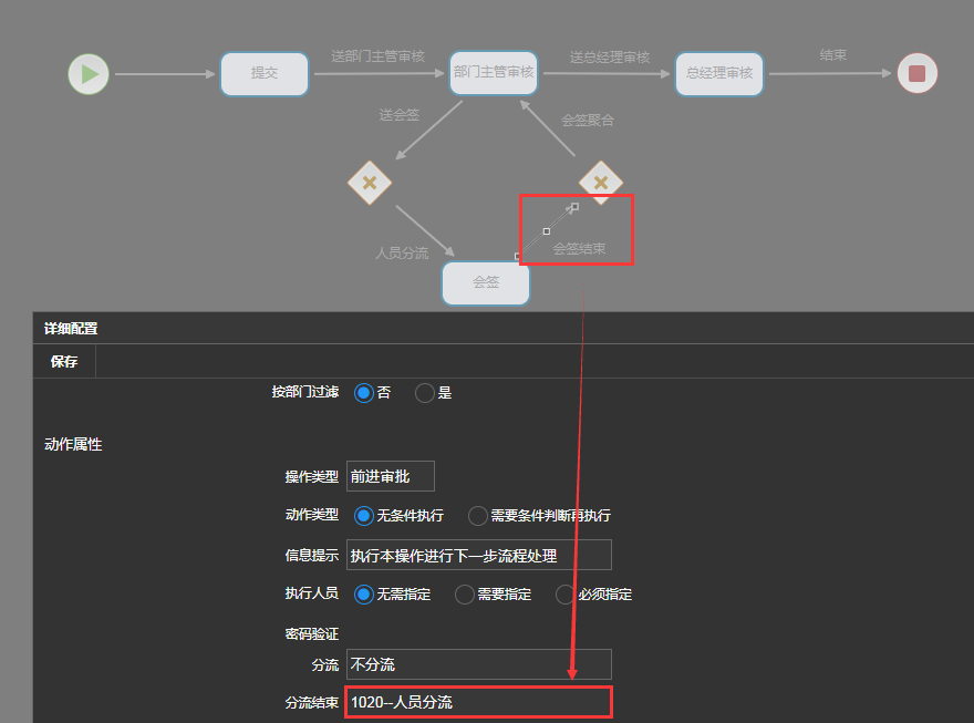 - 添加“会签结束”连线,将会签后的数据传回“部门主管审核”节点,并且选择人员分流结束,如下图: