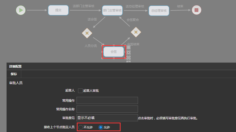 - 添加“会签”控件,在此处处理会签人员的审批动作,设置当前节点允许接收上一节点指定的人员,如下图: