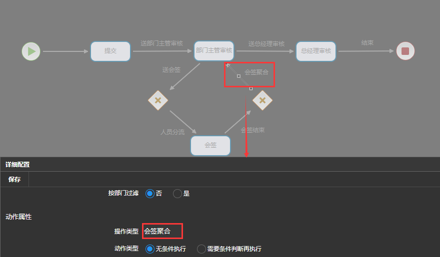 - 添加“会签聚合”连线,设置操作类型为会签聚合,如下图: