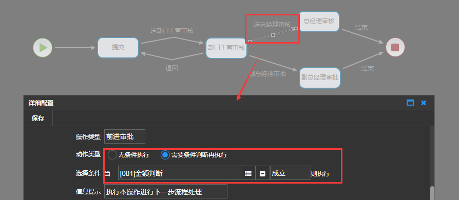 - 在“送总经理审批”连线控件中设置判断条件成立,如下图: