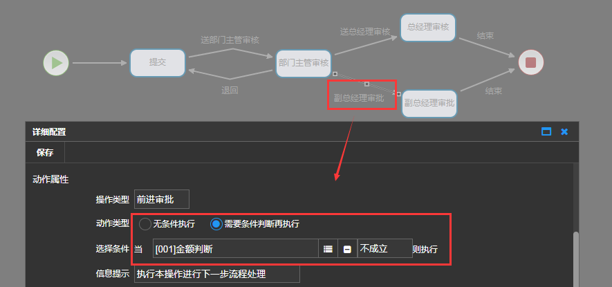 - 在“送副总经理审批”连线控件中设置判断条件不成立,如下图: