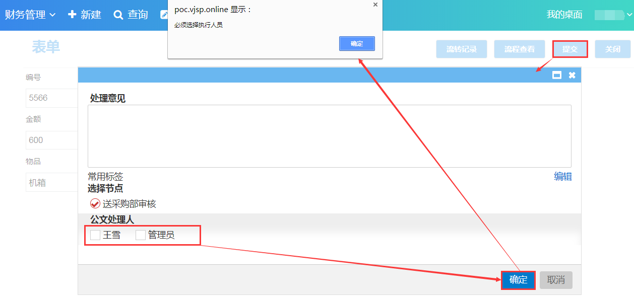 效果如下 :登录应用平台,打开窗体提交采购部审核,选择审核人员,如下图: