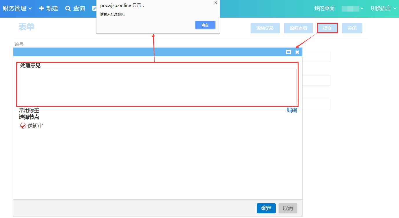 效果 :登录应用平台,点击窗体进行审核,点击【提交】,弹出页面选择审核人,点击【确定】,审核人登录系统后即可审核窗体,效果如下图: