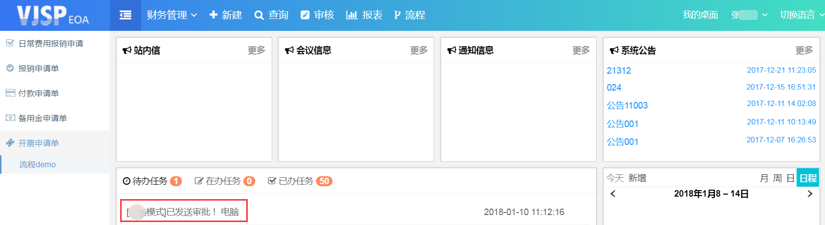 退回上一级后,财务部经理登录平台,点击待办窗体,点击【流转记录】,效果如下图: