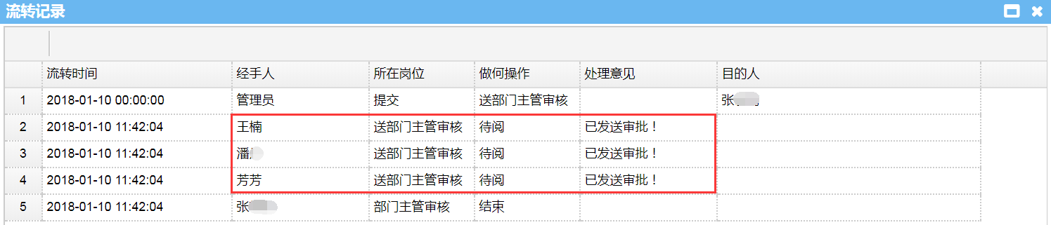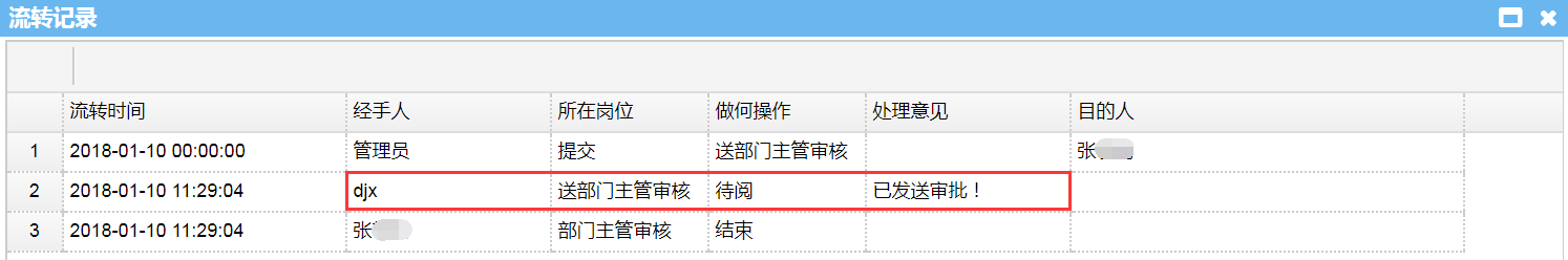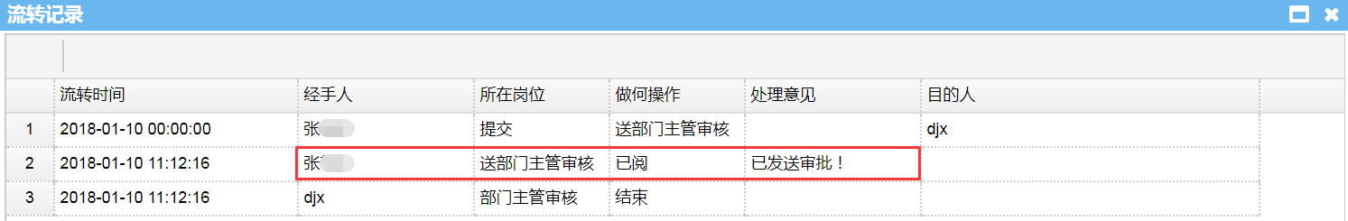 部门领导审核人员登录应用平台,点击窗体中【流转记录】效果如下图: