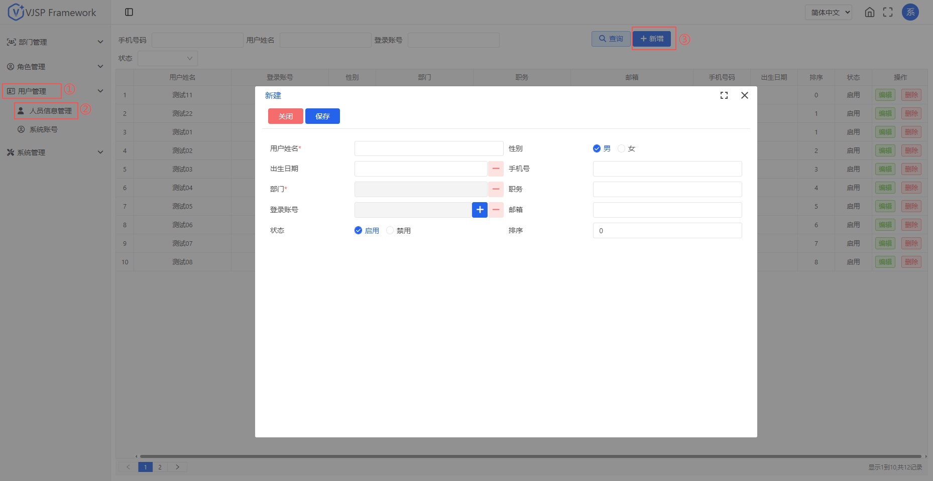进入【用户管理 - 人员信息管理】页面,点击“新增”。填写信息,保存后生成唯一人员记录。