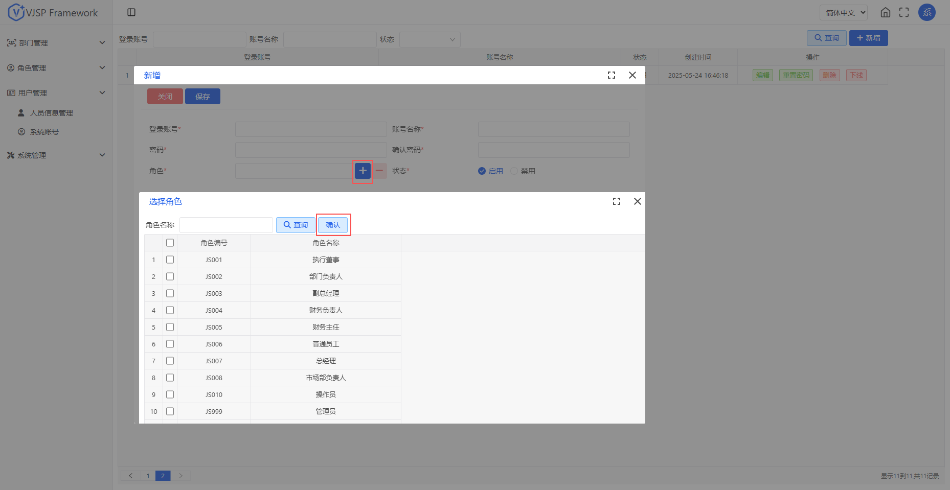在账号新建或者编辑界面,从角色列表中勾选一个或多个角色,点击【确认】。账号将继承所选角色的菜单权限、操作权限及数据权限范围。