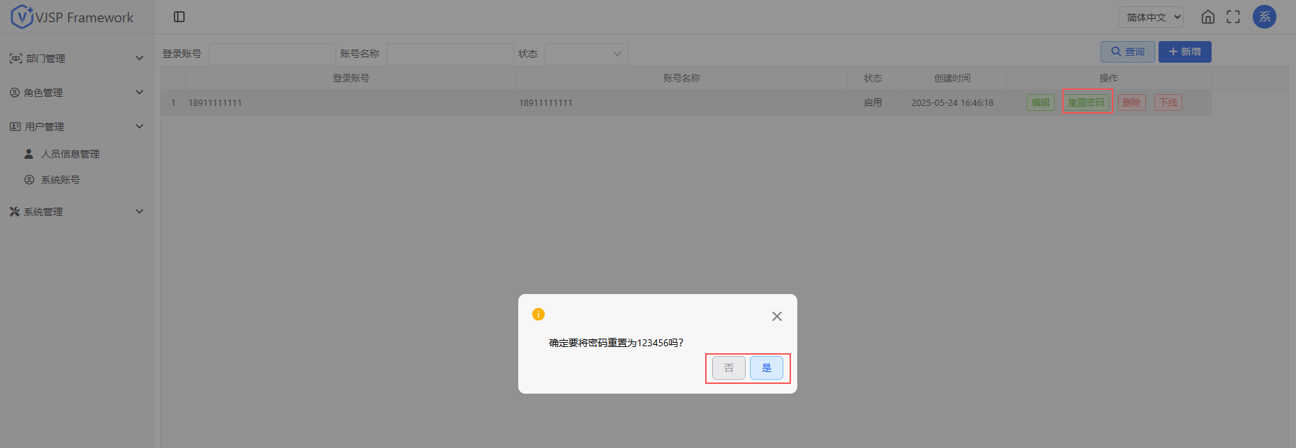 管理员可为任意账号强制“重置密码”。点击【重置密码】,弹出提示窗选择【是】,即可重置账号密码。