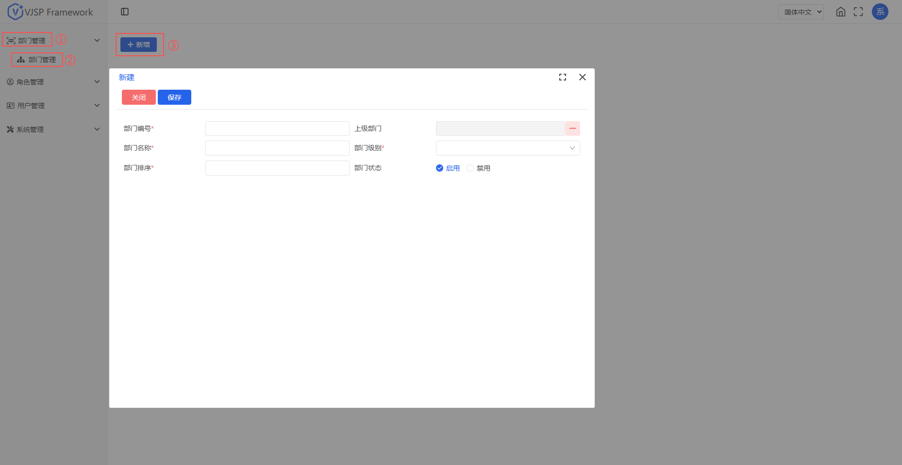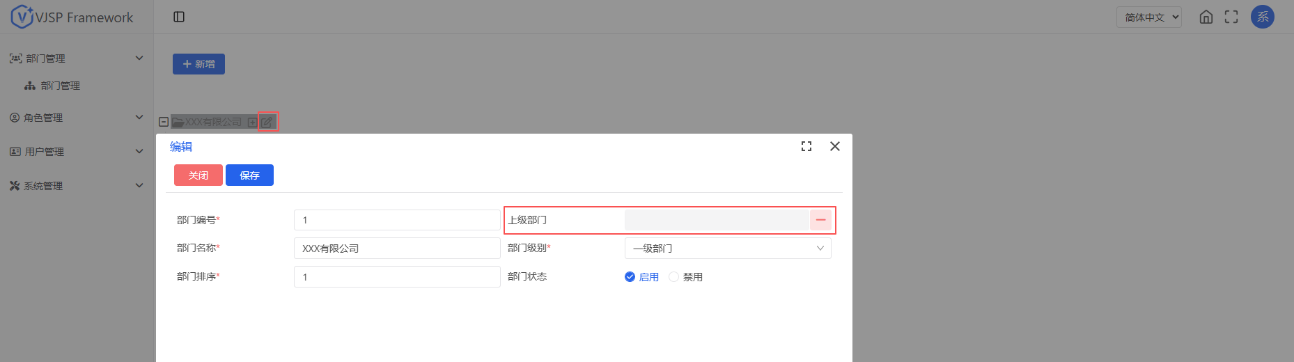 进入【部门管理】页面,点击【新增】。设置部门编号、名称、上级部门,部门级别,部门排序,状态。