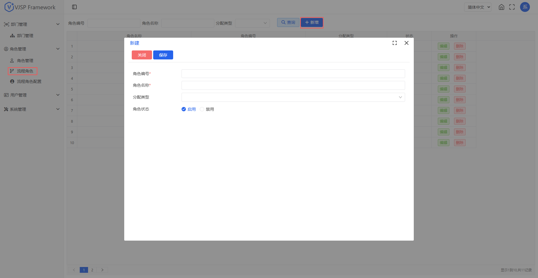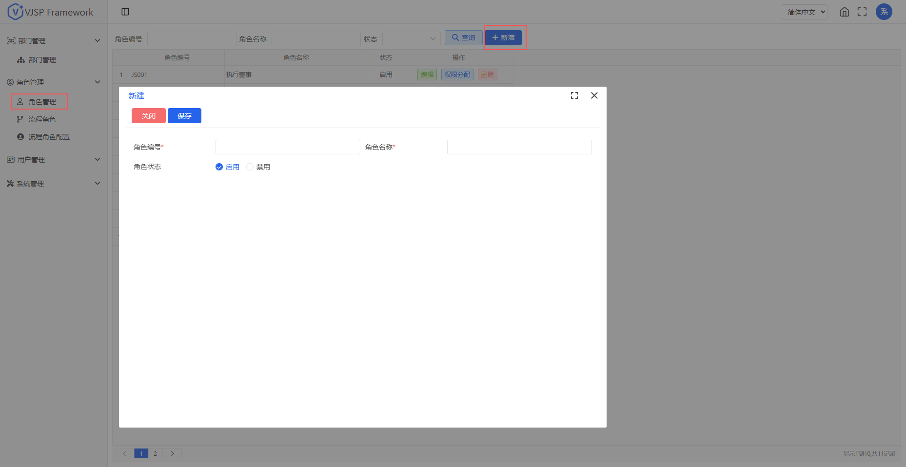 进入【角色管理 - 角色管理】页面,点击【新增】按钮,输入角色编号,名称并选择状态。