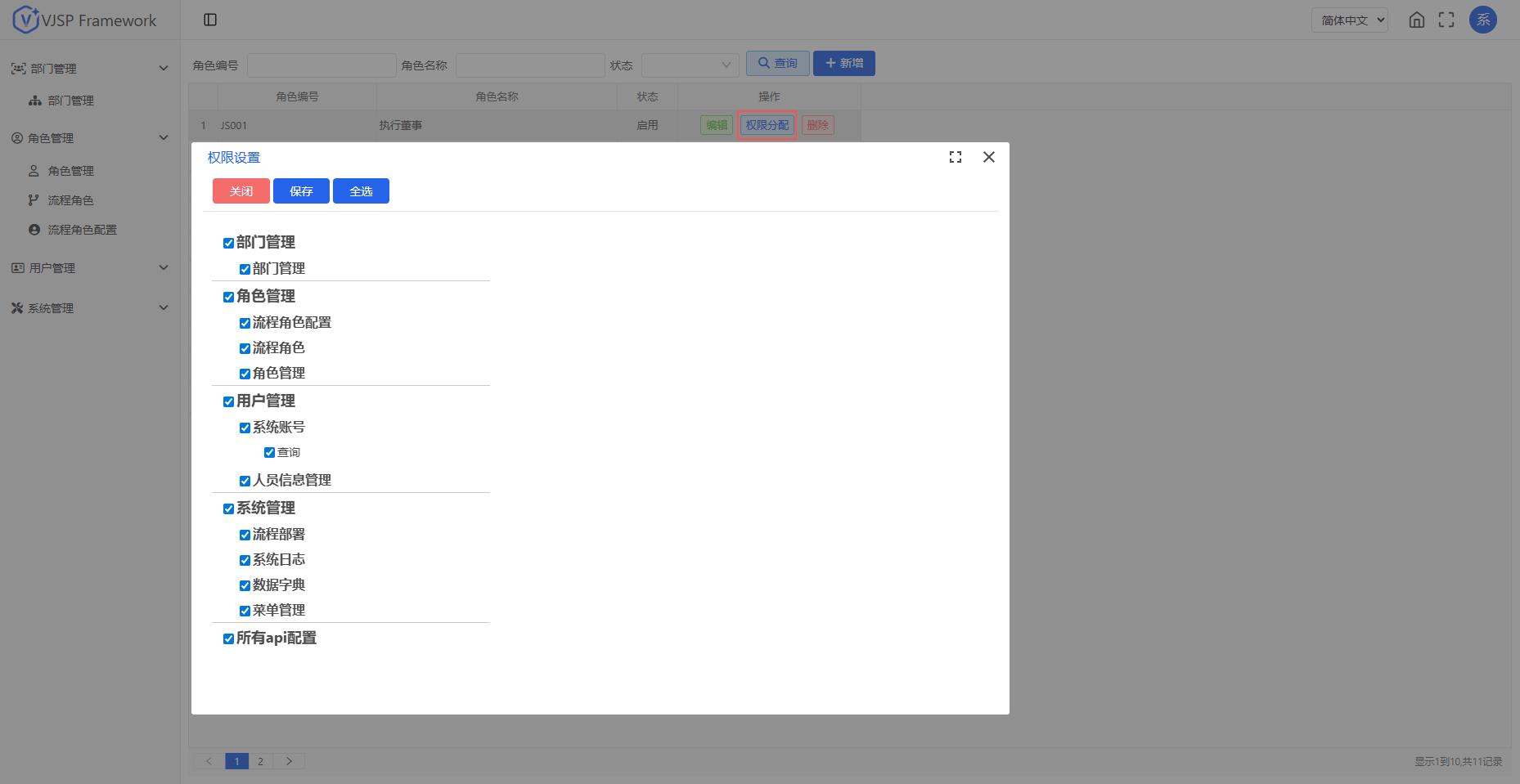点击【权限分配】,选择角色允许访问的菜单及按钮权限。