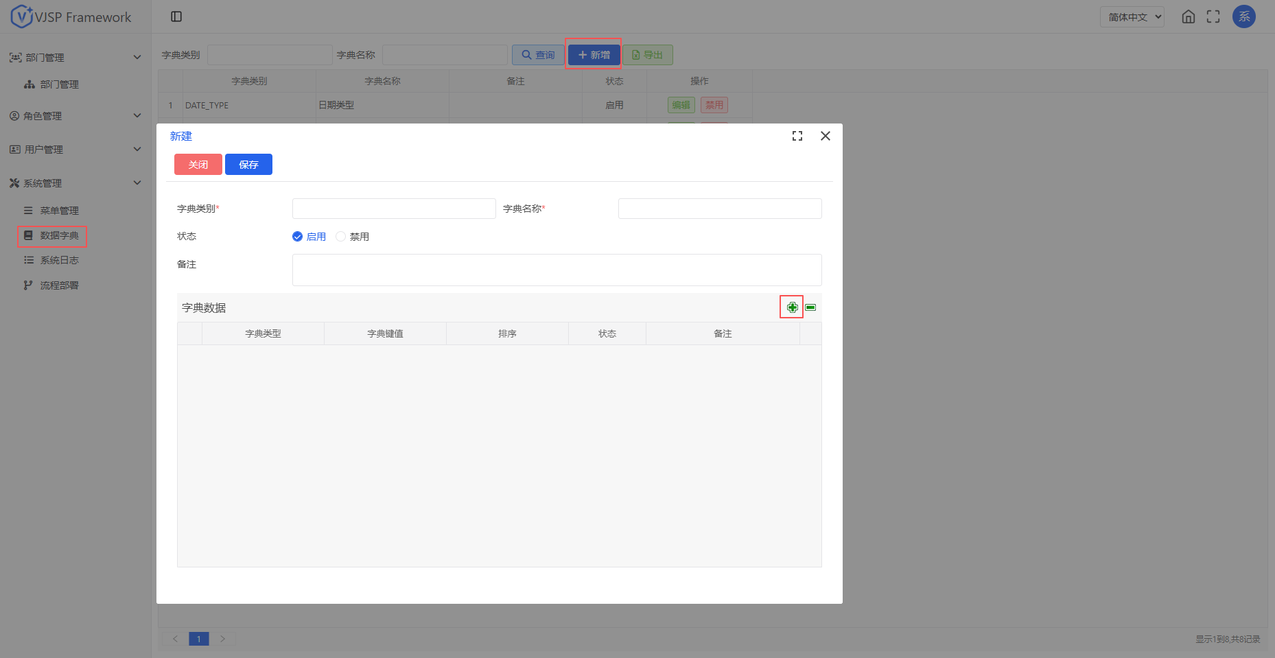 进入【系统管理 - 数据字典】管理页面,点击“新增”。