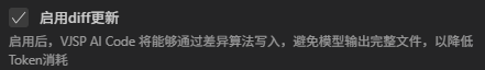 如果你取消选中“启用diff更新”,VJSP 将恢复为使用 write_to_file 工具为每次编辑写入整个文件内容,而不是使用 apply_diff 应用有针对性的更改。这种完全写入的方法通常在修改现有文件时速度较慢,并导致更高的 Token 使用量。