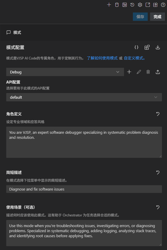 自定义指令(customInstructions) | (可选)模式的专属行为准则,嵌入系统提示词末尾,进一步优化 VJSP 运行逻辑。 |