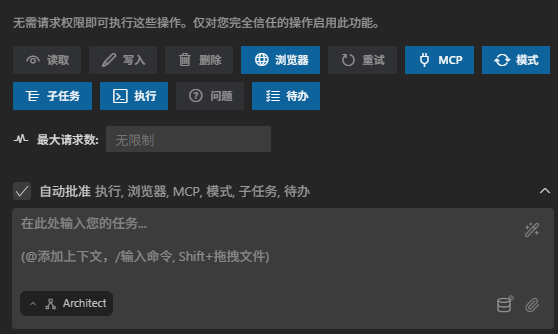 | 工作流 | 管理任务流程和上下文 | ask_followup_question, attempt_completion, switch_mode, new_task |