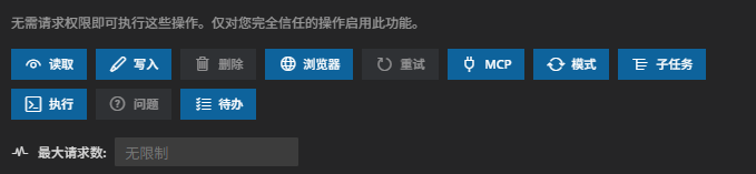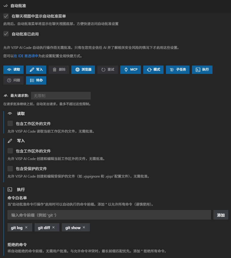 允许 VJSP 自动执行操作而无需批准。仅在你完全信任 AI 并了解相关安全风险的情况下才启用这些设置。