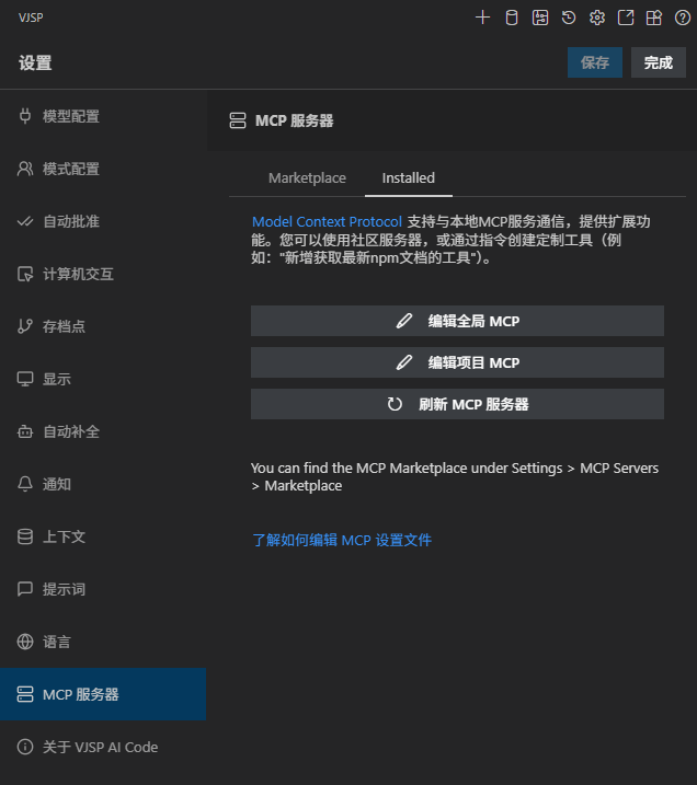 你可以直接从VJSP MCP设置视图编辑全局和项目级MCP配置文件: