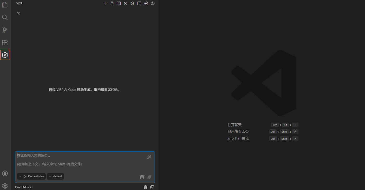 点击 VS Code 主侧边栏(窗口侧边的垂直栏)中的 VJSP 图标打开聊天界面。如果看不到图标,请确认扩展已安装并启用。