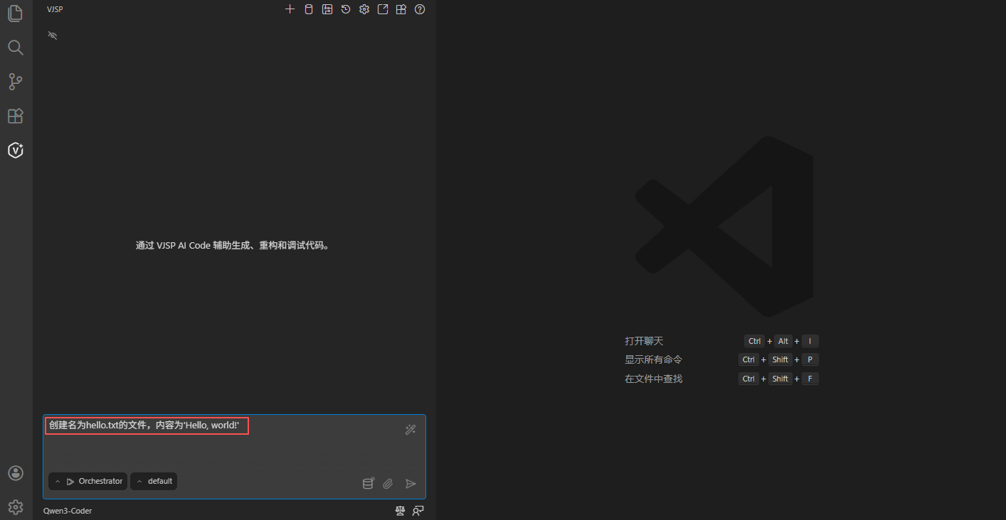 在面板底部的聊天框中,清晰简洁地描述你希望 VJSP 完成的操作。有效任务的示例: